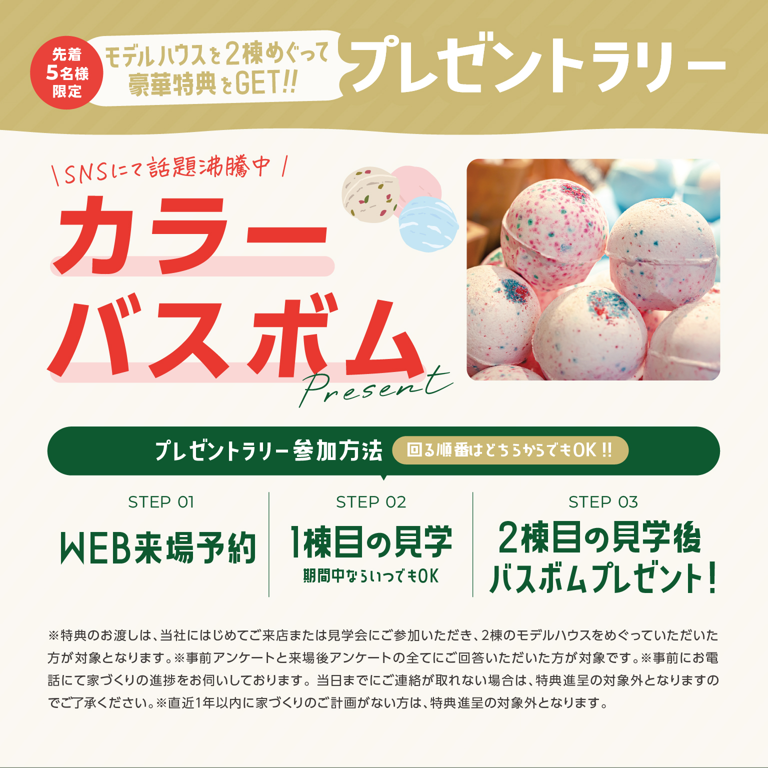 先着5名様限定で、SNSで話題のカラーバスボムをプレゼントいたします。WEBから来場予約をしていただき、2棟のモデルハウスをご見学いただくと特典をお渡しします。
