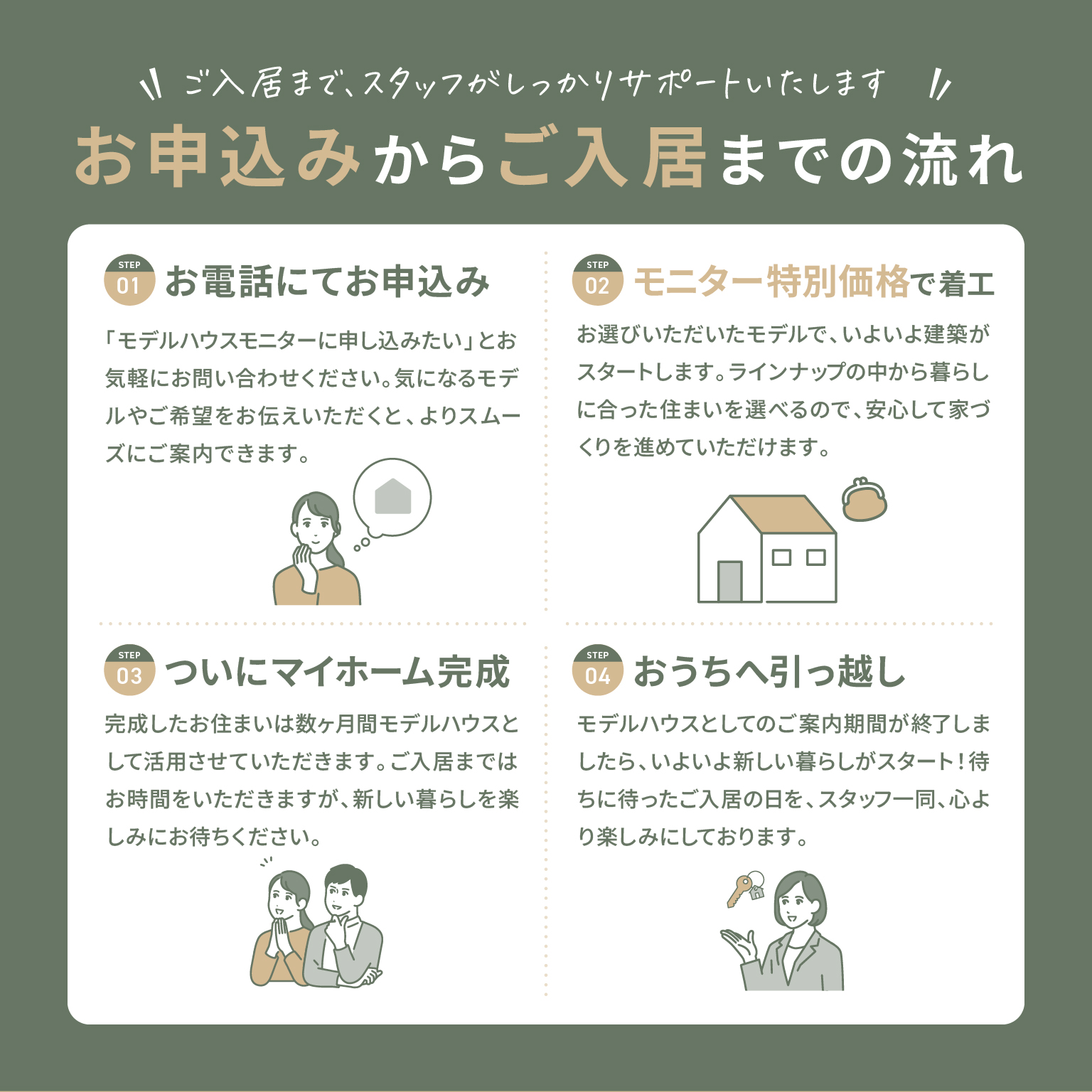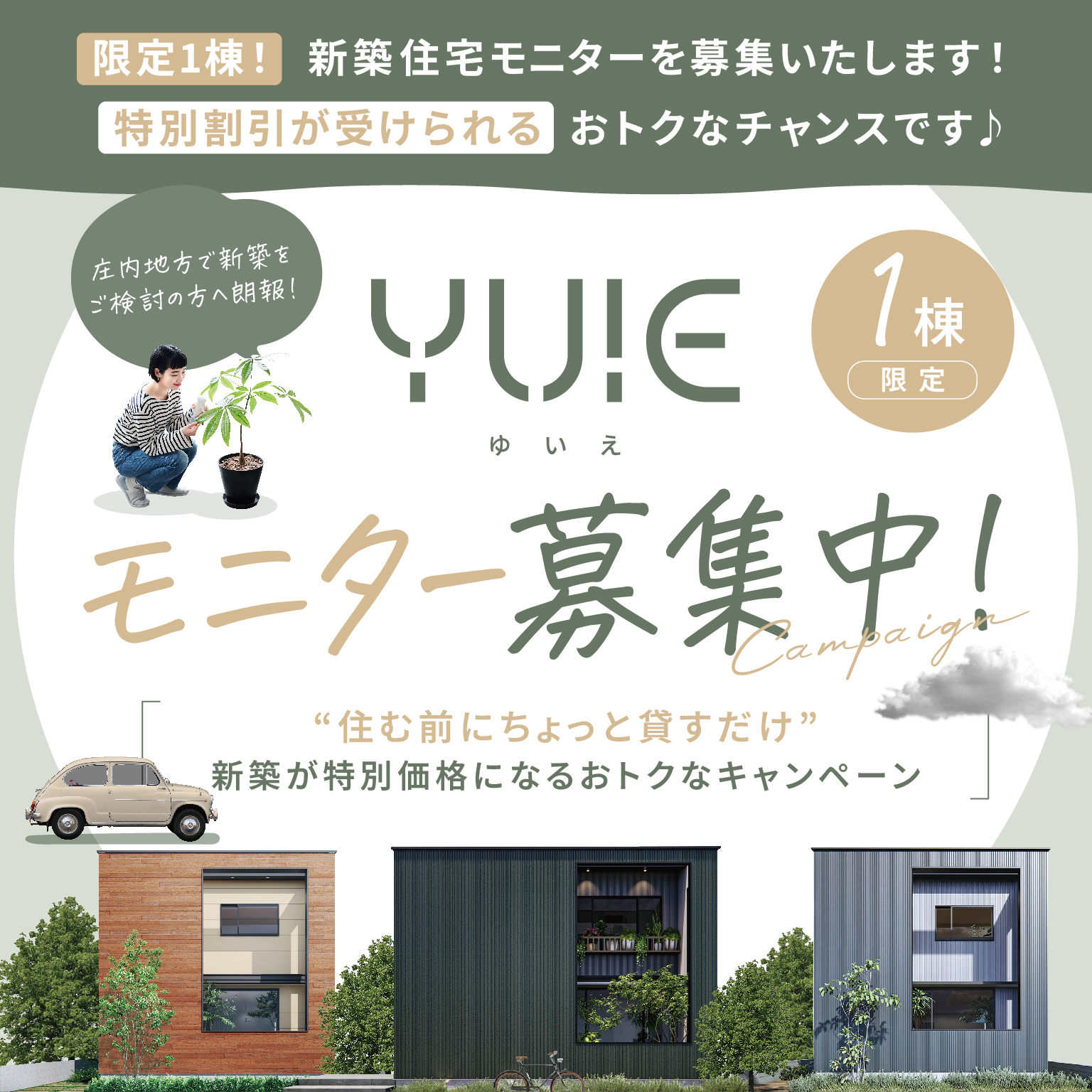 期間中は、新築住宅モニター「YUIE(ゆいえ)」の募集も行っています。入居前の数ヶ月間モデルハウスとして活用させていただくことで、新築が特別価格になるお得なキャンペーンです。庄内地方で新築をご検討されている方は、ぜひこの機会をご活用ください。