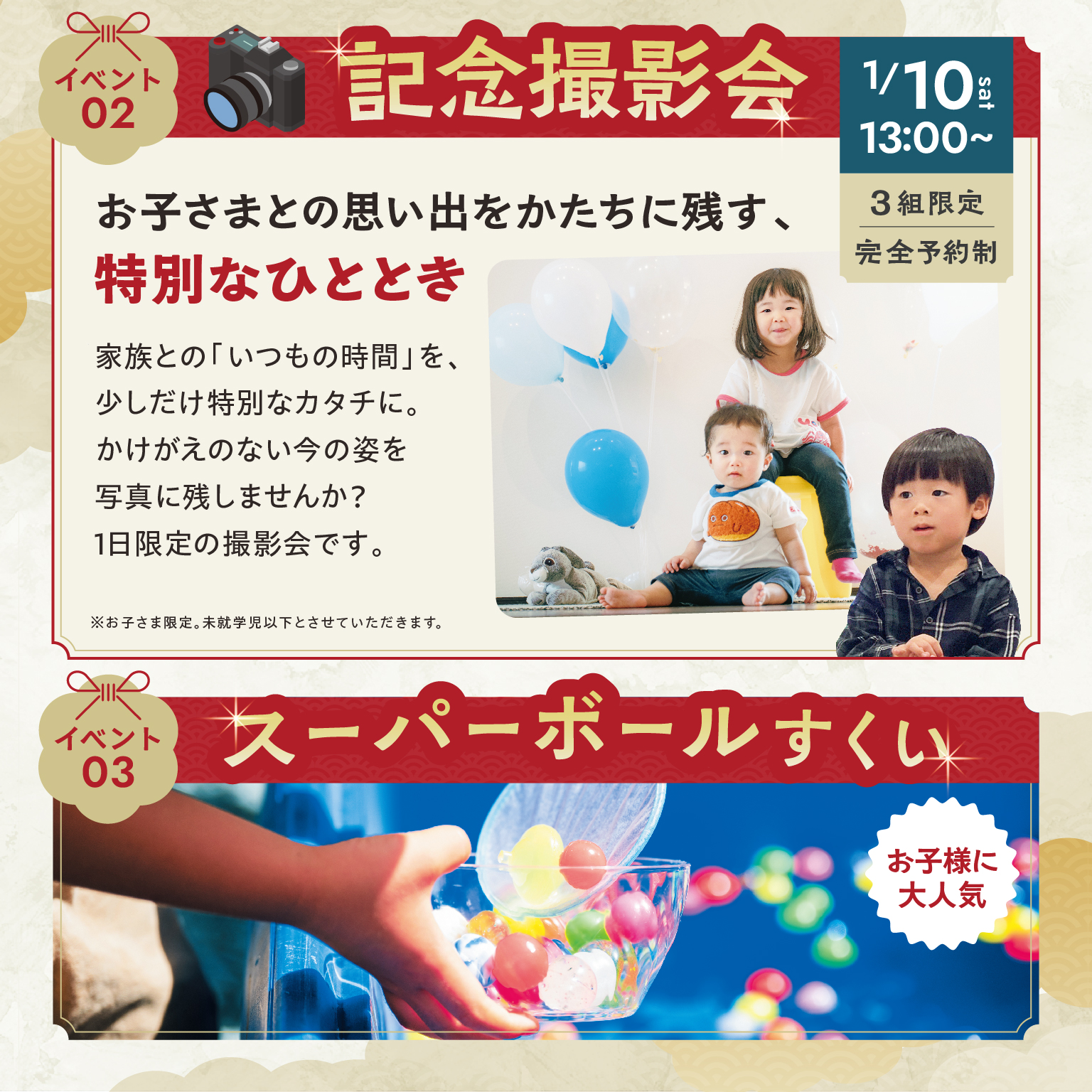 イベント2つ目は、家族の思い出をきれいな写真に残せる「記念撮影会」です。お子さまやご家族との大切な時間を写真に残すことができる特別な1日です。1月10日の13時より、3組限定の完全予約制となります。