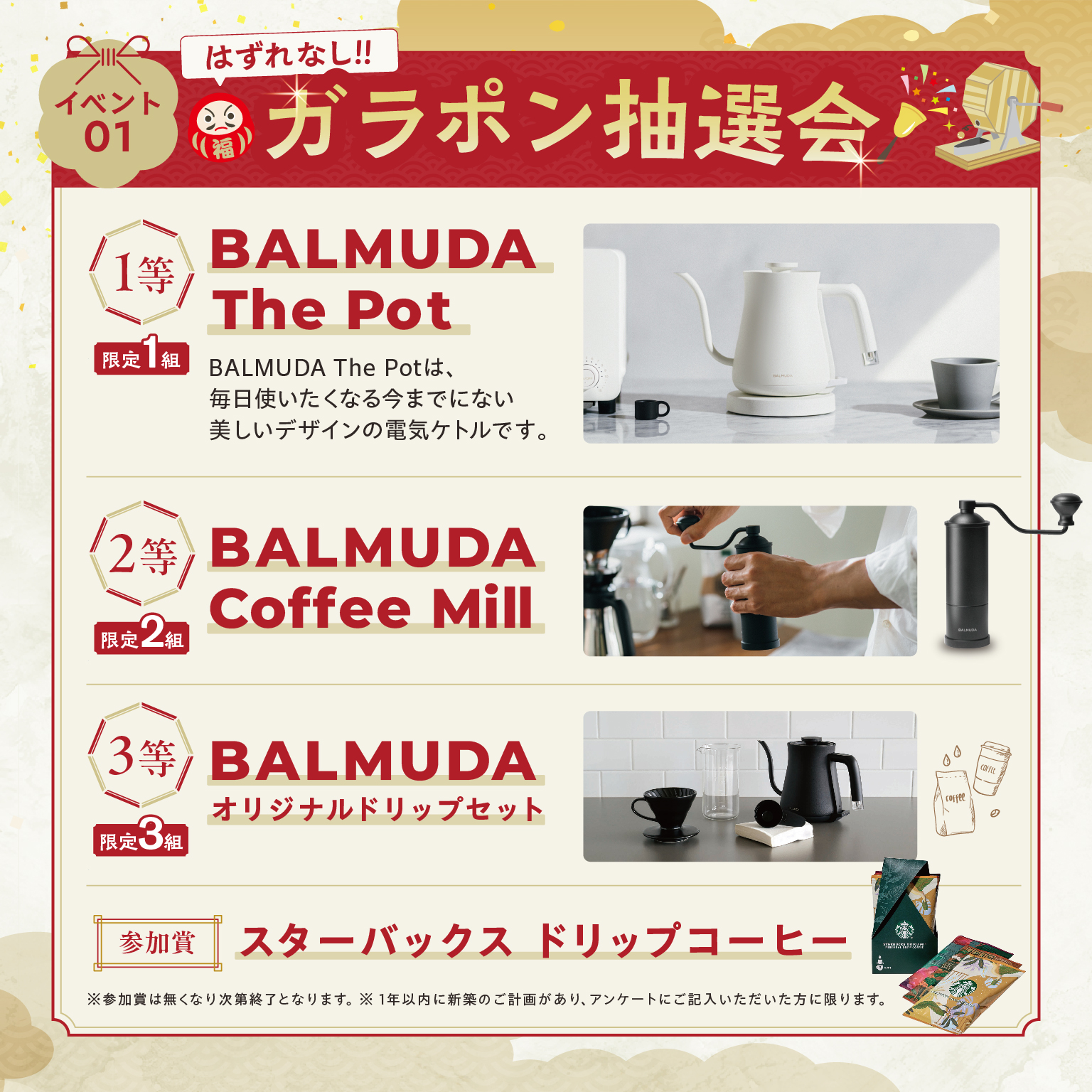 イベント1つ目は、はずれなしの「ガラポン抽選会」です。1等は毎日使いたくなるデザインの電気ケトル「BALMUDA The Pot」、2等は「BALMUDA Coffee Mill」、3等は「BALMUDAオリジナルドリップセット」をご用意しています。参加賞として、スターバックスのドリップコーヒーもお渡しいたします。