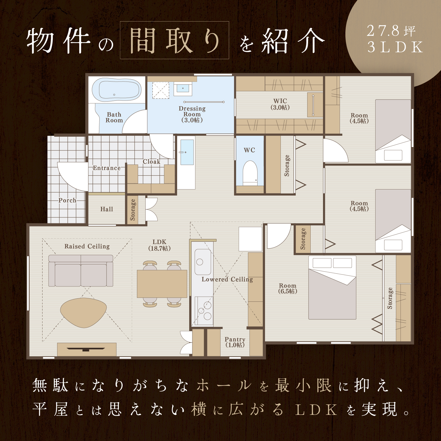 今回ご覧いただけるのは、27.8坪・3LDKの平屋。