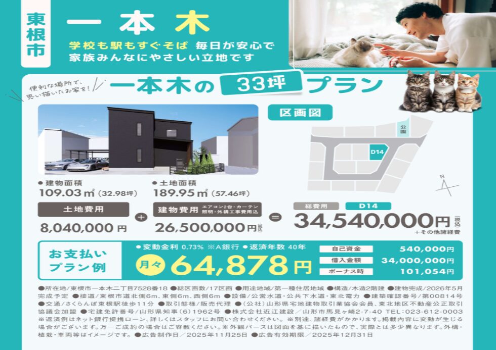 【東根市内 平屋物件】公園側の分譲地、月々5万円台から
