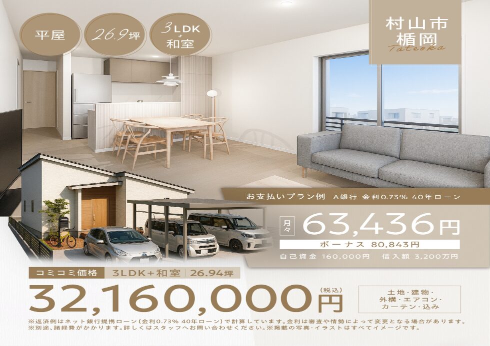 【東根市内 平屋物件】北西角地、月々6万円台から